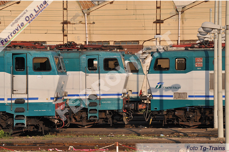 Gli inconfondibili profili di tre "Caimani" ed una "Tigre", a riposo nel deposito locomotive di Messina. (Foto Tg-trains.com, 29 agosto 2009)