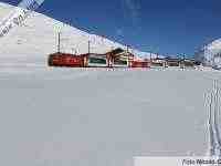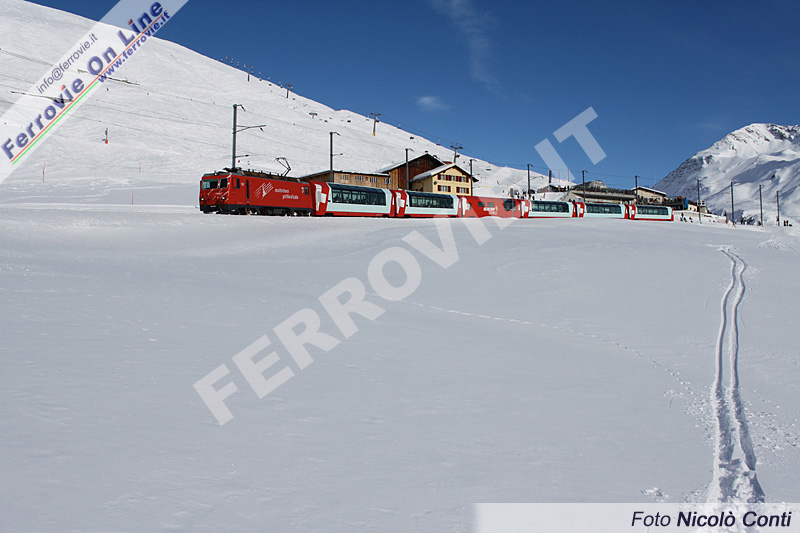 Il treno diretto 903 "Glacier Express" proveniente da St. Moritz e diretto a Zermatt, trainato dalla HGe 4/4 II 102 della Matterhorn-Gotthard-Bahn (MGB), attraversa i campi da sci di Nätschen, poco dopo aver lasciato l'omonima stazione sita lungo la linea che dal Passo dell'Oberalp porta ad Andermatt. (Foto Nicolò Conti, 3 gennaio 2010)