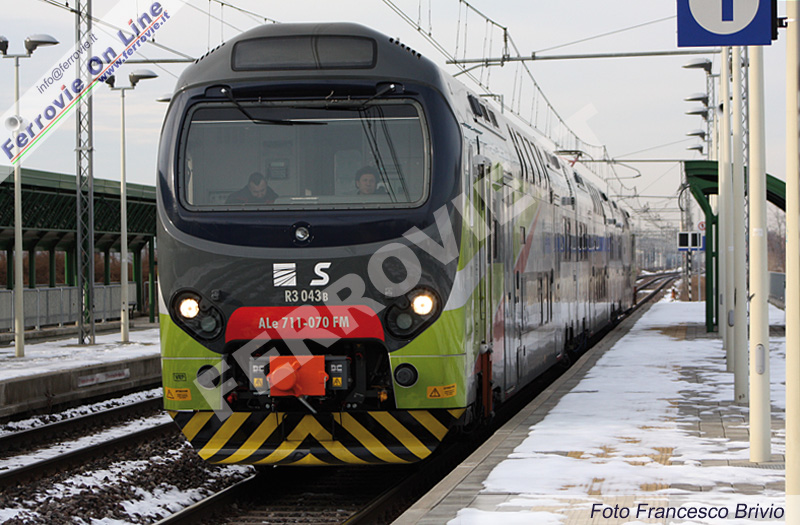 Complesso di elettromotrici ALe 711 in forza al Servizio Ferroviario Regionale sul Passante Ferroviario di Milano, in arrivo a Pozzuolo Martesana. (Foto Francesco Brivio, 26 dicembre 2009)