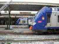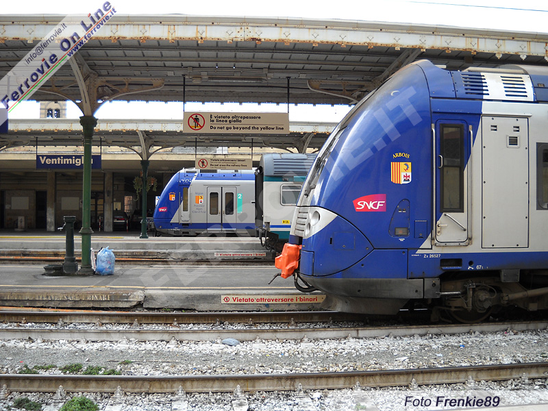Mix di rotabili francesi ed italiani nella stazione di Ventimiglia. In primo piano e sullo sfondo elettrotreni a doppio piano SNCF serie Z 26500. Nel mezzo una carrozza per Medie Distanze di Trenitalia. (Foto Frenkie89, 14 febbraio 2010)
