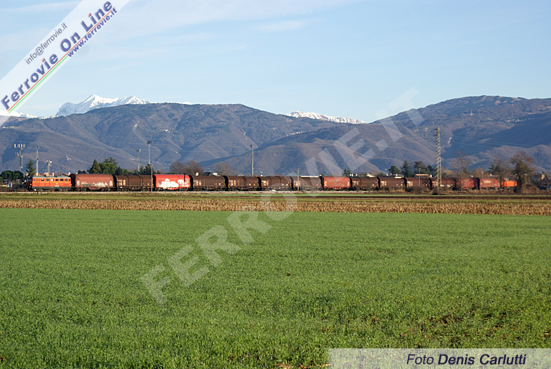 Le Alpi Giulie fanno da sfondo al treno merci da 1100 tonnellate carico di coils, diretto dalla Germania allo scalo di Bottenicco. La trazione da Udine a Bottenicco è stata assicurata dalla Ld405 FUC ( Mak C700) in testa e dalla DE424 02 FUC in spinta. Anche se a titolo sperimentale, dopo molti anni di assenza ritorna un servizio merci su questa linea. (Foto Denis Carlutti, 10 dicembre 2009)