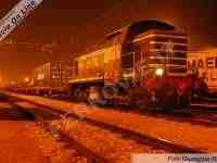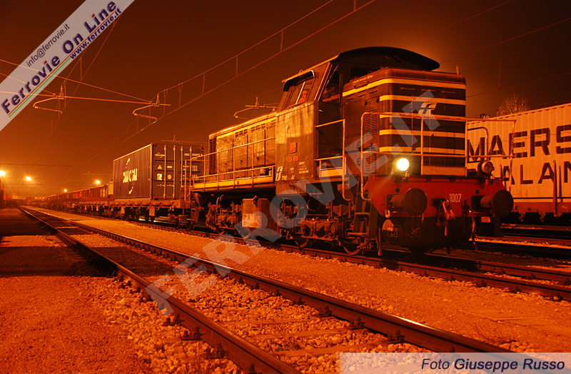 Suggestiva immagine notturna dell'anziana ma efficiente D 141.1007 a Padova Interporto, illuminata dalla torre faro che le conferisce la particolare dominante giallo-arancio, mentre manovra una lunga teoria di carri. (Foto Giuseppe Russo, 23 febbraio 2010)