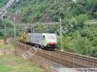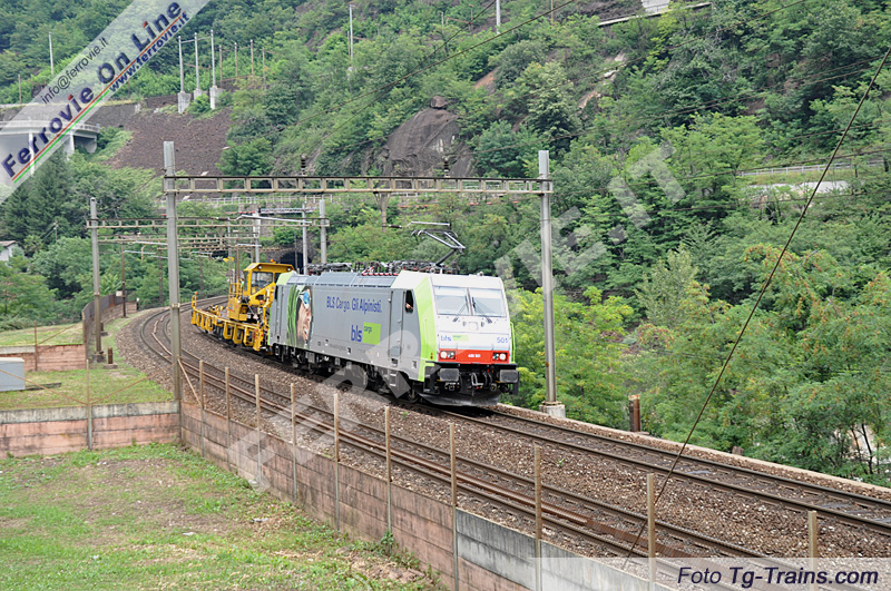 Minimo sforzo per la 486.501 di BLS, impegnata nel trasferimento verso il Ticino di un leggero mezzo d'opera, qui al termine dei tornanti tra Lavorgo e Bodio. Immancabile il tipico saluto svizzero del macchinista, che sporge attraverso il finestrino laterale la mano destra con il dito indice teso verso il fotografo. (Foto Tg-Trains.com, 30 luglio 2009)