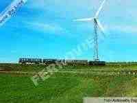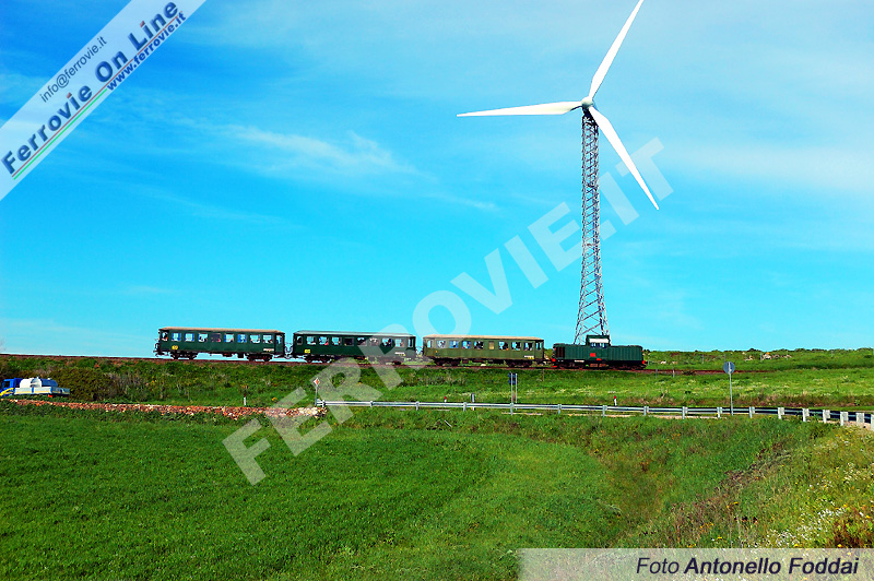 Una imponente pala eolica domina la breve composizione del Trenino Verde delle Ferrovie della Sardegna, in viaggio nel giorno di Pasquetta nei pressi della stazione di Nulvi. (Foto Antonello Foddai, 09 aprile 2007)
