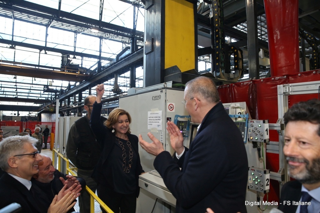 PISTOIA - Il "Rock" entra in produzione. Il nuovo treno per il Trasporto Regionale di Trenitalia inizia a prendere forma nello stabilimento Hitachi Rail Italy di Pistoia. Venerdì 20 gennaio l'amministratore delegato di Trenitalia Barbara Morgante, ha simbolicamente avviato la costruzione del primo treno dando il via alla saldatura laser di un elemento del telaio. Alla cerimonia pistoiese, durante la quale è stato svelato il mock-up del treno in scala 1:1, hanno partecipato anche Renato Mazzoncini amministratore delegato di FS Italiane, Tiziano Onesti presidente Trenitalia ed il padrone di casa Maurizio Manfellotto, CEO di Hitachi Rail Italy.