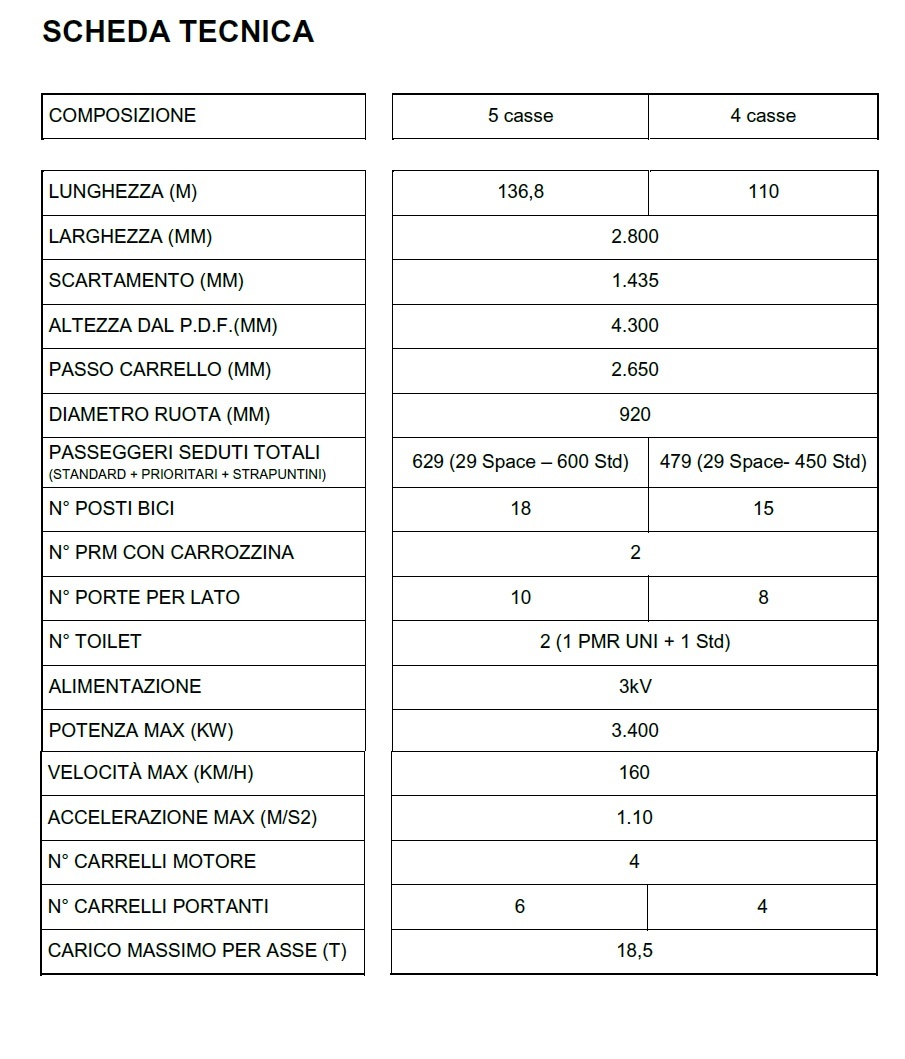 Il nuovo elettrotreno di Hitachi Rail Italy, inizialmente battezzato dal costruttore "Caravaggio" (vedi News ferroviarie del 29/06/2016), sarà composto da 4 o 5 casse parzialmente a doppio piano, lungo rispettivamente 110 o 136 metri e largo 2,8 con una capacità complessiva di 656 passeggeri.
