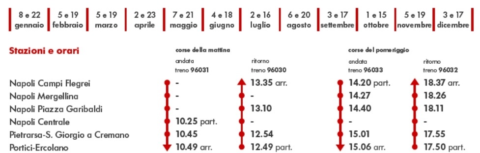 Collegati a trenitalia.com, imposta come stazione di arrivo "Pietrarsa-S. Giorgio A Cremano" e scegli la data di partenza tra quelle disponibili sulla locandina.