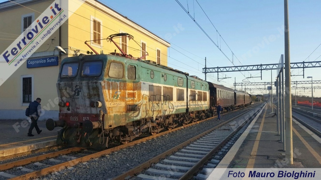 CAPRANICA (Viterbo) - Domenica di Carnevale con il treno a vapore nella Tuscia. Il 26 febbraio l'associazione Terra Tua in collaborazione con Fondazione FS, ha organizzato un treno speciale da Roma a Capranica per il Carnevale di Ronciglione. La 625.017 con 3 carrozze a Terrazzini è partita alle 8.20 da Roma Tiburtina, con in spinta la E.655.453 fino ad Anguillara dove è stata sganciata.