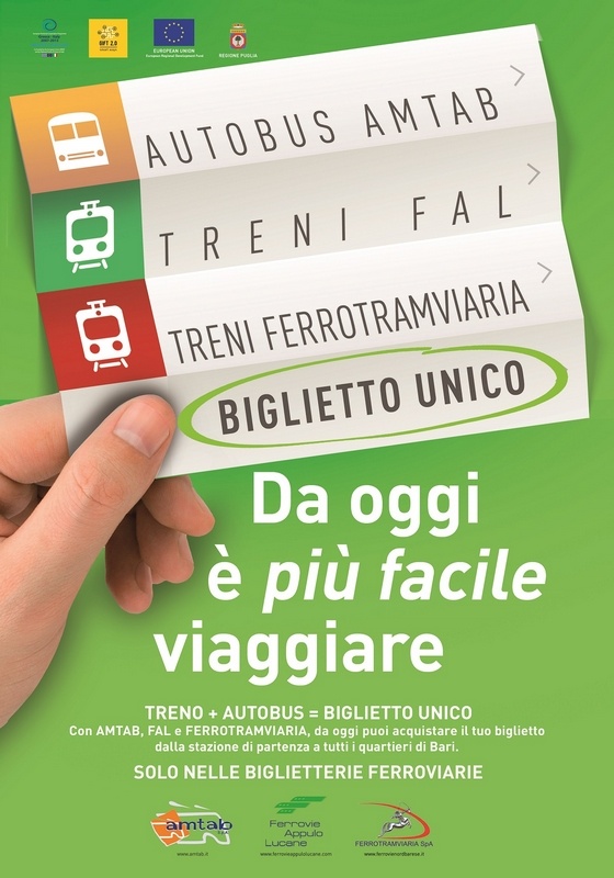 Un unico biglietto per viaggiare tra Puglia, Basilicata, Nord Barese, Aeroporto, Area Metropolitana e Città di Bari. Da oggi è possibile grazie al progetto europeo ETCP Greece - Italy 2007 - 2013 "Gift 2.0" in cui rientra il 'caso pilota' Unique ticketing, biglietto unico tra Amtab, Ferrovie Appulo Lucane e Ferrovie del Nord Barese, di cui FAL è soggetto attuatore individuato dalla Regione Puglia.