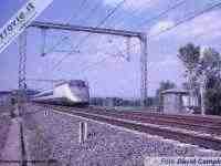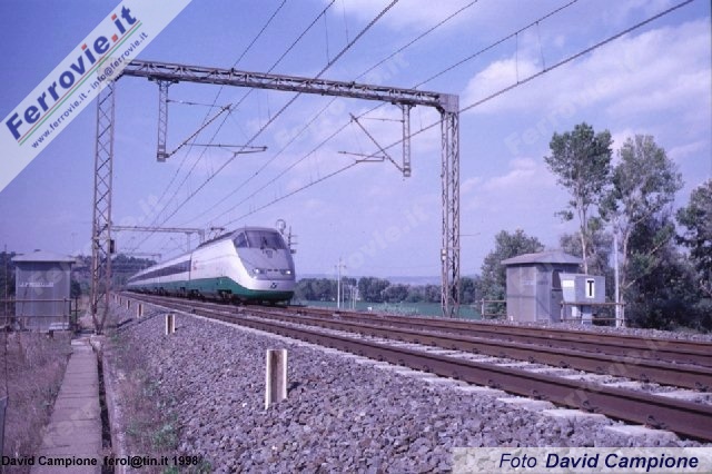 Un ETR.500 in servizio Eurostar tra Milano e Roma sfreccia sulla Direttissima, nei pressi di Civita Castellana (Foto David Campione, 13 settembre 1997)