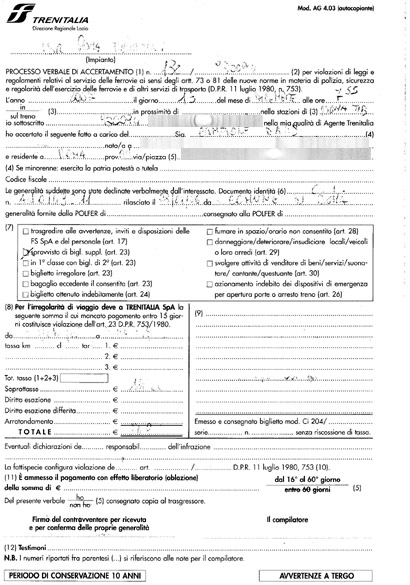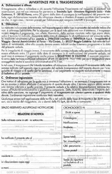 Ma di fatto dobbiamo pagarlo o contestarlo questo verbale! Sul retro c'è scritto che possiamo far pervenire delle osservazioni a "Trenitalia Spa - Direzione Trasporto Regionale Lazio - Viale Castrense, 9 - 00182". Decidiamo di recarci di persona presso i loro uffici ma...sorpresa! Gli uffici non ci sono più! All'indirizzo indicato troviamo un portone sbarrato. Di fuori vetrofanie "FS Trenitalia" sui vetri ed un cartello che cita: "Comune di Roma - Lavori di manutenzione ordinaria ecc.ecc." Non un cartello che indichi dove si è trasferita la DTR Lazio, non una persona che risponda al citofono che suoniamo con insistenza. Nulla. Ovvio: gli uffici sono vuoti in quanto trasferiti altrove. E se a questo indirizzo anziché venirci di persona avessimo inviato una raccomandata?