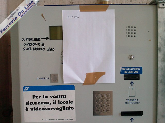 Prima della partenza ci rechiamo al bar dove abbiamo sempre acquistato i Metrebus (così si chiama a Roma il biglietto valido 75' sui mezzi urbani di FS, TRAMBUS, METRO e COTRAL) ma, fatalità, oggi sono terminati. A questo punto immaginiamo di poterlo acquistare in stazione a Settebagni. Sappiamo bene che le biglietterie con operatore negli impianti più piccoli sono ormai un lontano ricordo, ma nella nostra piccola (e molto frequentata) stazione di periferia c'è il distributore automatico di biglietti. Ad attenderci nell'atrio troviamo in effetti un grosso 'armadione' grigio appeso al muro: la biglietteria automatica!