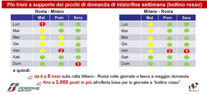 Nascono anche i giorni con il "Bollino rosso": nelle giornate di lunedì, venerdì e domenica, l'offerta sarà potenziata tra le due città con treni supplementari nelle fasce orarie a maggior domanda.
