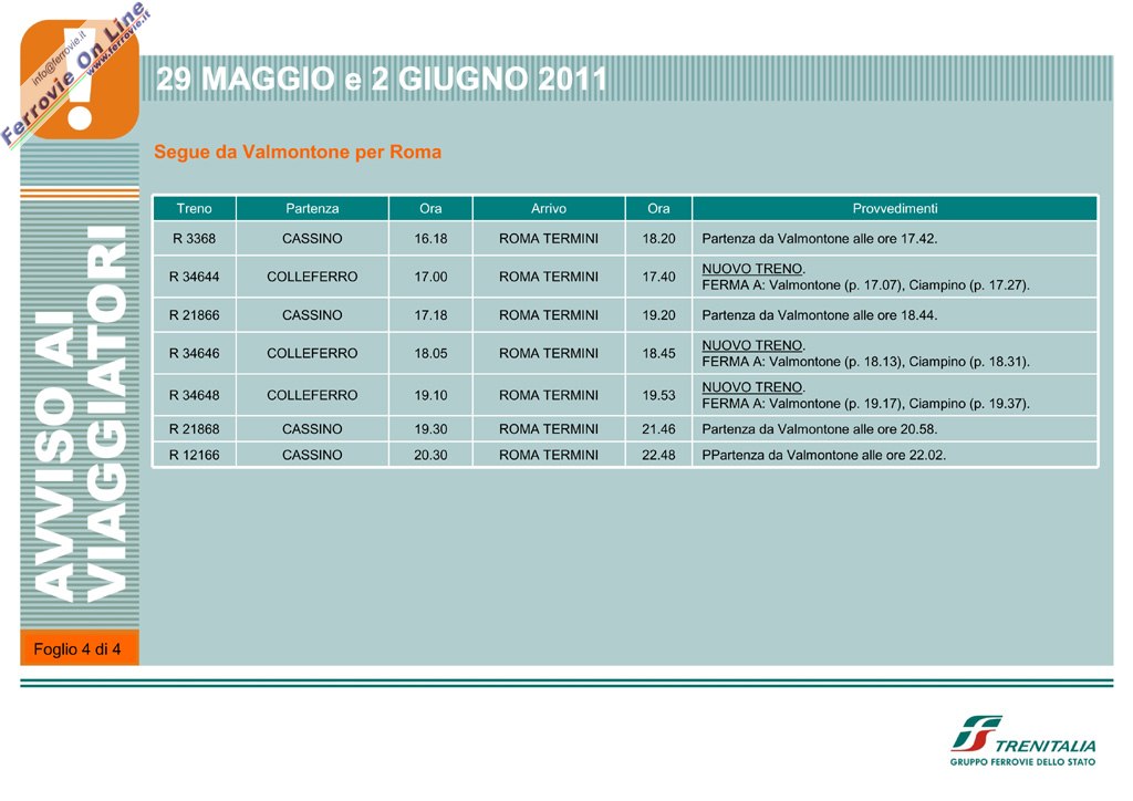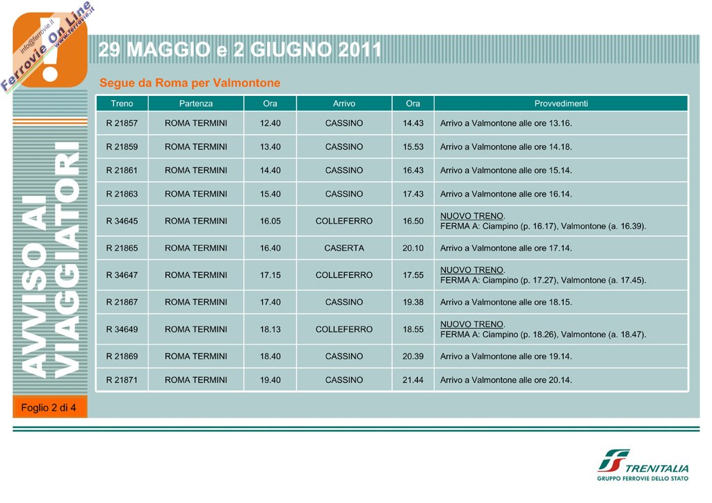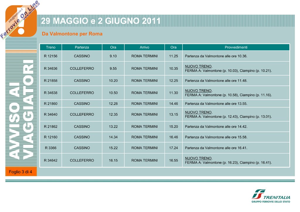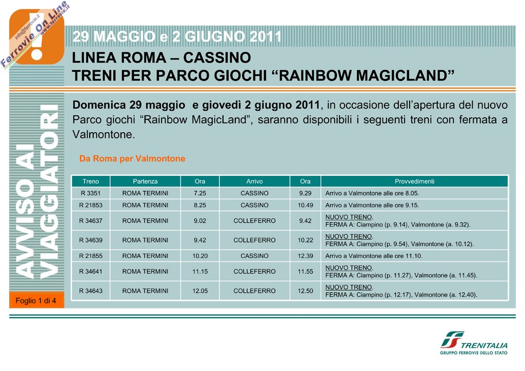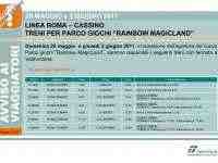 Programmata l'effettuazione di alcuni treni Regionali tra Roma Termini e Valmontone - Colleferro per domenica 29 maggio e giovedì 2 giugno 2011, in occasione dell'apertura del nuovo parco giochi "Rainbow MagicLand".