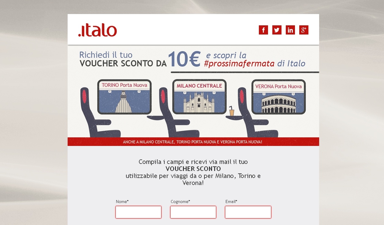 Da oggi infatti tutti i clienti potranno partecipare attivamente all'iniziativa, accedendo alle pagine Facebook, Twitter e Instagram di Italo, che da sempre riscuotono tanti like tra i propri followers. Tramite video, quiz, e tanti altri contenuti da scoprire partecipando a #PROSSIMAFERMATA ci si potrà divertire insieme a Italo ed in più ricevere un fantastico regalo. Italo invierà a coloro che prenderanno parte alla campagna un voucher sconto del valore di 10 euro per viaggiare da o per Milano, Torino e Verona dall'11 gennaio al 23 marzo 2016.