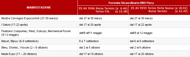 La speciale fermata del Frecciarossa a Rho Fiera Milano è prevista per gli eventi e periodi indicati nella seguente in tabella.