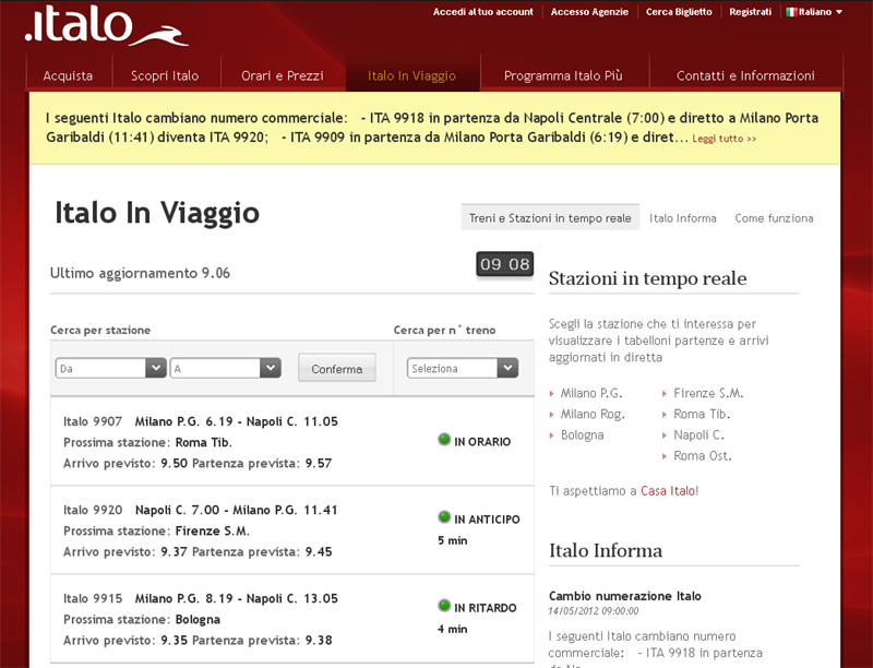 Dal 16 maggio è on line sul sito www.italotreno.it, "Italo in Viaggio", la sezione che aggiorna i viaggiatori in tempo reale sull'andamento della circolazione di tutti i treni Italo e sulle principali notizie di servizio. Nella stessa schermata è possibile anche consultare i tabelloni arrivi/partenze presenti nelle stazioni AV.