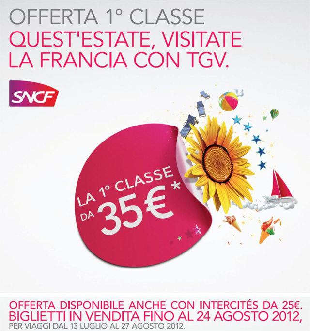 * Offerta valida su TGV e INTERCITÉS, prezzi con tariffa Prem's, a partire da 35euro per persona con TGV, a partire da 25euro per persona con INTERCITÉS, valida per la sola andata in 1° classe, in determinati giorni e su determinati treni, su una selezione di destinazioni in Francia ed internazionali, nel limite dei posti disponibili a questa tariffa. I biglietti sono in vendita dal 10 Luglio al 24 Agosto per viaggiare dal 13 Luglio al 27 Agosto inclusi. Biglietti acquistabili con almeno 3 giorni di anticipo dalla data del viaggio. Biglietti non cambiabili e non rimborsabili. Offerta non cumulabile