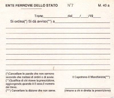 A questi documenti, quasi sempre sono allegate specifiche prescrizioni, fatte firmare dal dirigente di movimento al macchinista e controfirmate dal capotreno (M 40) di carattere commerciale (disabilitazione biglietterie, obliteratrici guaste) antifortunistico (marciapiedi di limitata lunghezza, camminamenti lungo linea inagibili) o di circolazione (abbassamenti archetti su tratti neutri, ricevimento in stazioni su binari non previsti o fermate non in orario, per servizio personale).