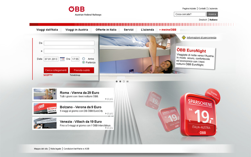 Da alcuni giorni il sito internet delle ÖBB (Ferrovie Austriache) www.obb-italia.com è online con un nuovo layout moderno e di semplice utilizzo per la clientela. Oltre alla maschera di prenotazione sulla home page completamente in italiano, è presente per i viaggiatori italiani una sezione dedicata con informazioni sui collegamenti in partenza dall'Italia divisi per tipologia: treni diurni DB-ÖBB EuroCity in partenza da Verona, Bologna e Venezia verso Innsbruck, ÖBB Intercitybus in partenza da Venezia e Udine verso Klagenfurt e Villach e treni notturni ÖBB in partenza da numerose città italiane verso Vienna. Sono inoltre disponibili le cartine dei collegamenti ferroviari dall'Italia all'Austria e per i viaggi interni all'Austria, nonché una sezione relativa alle informazioni su ognuna delle offerte e delle tariffe disponibili, con la descrizione e le relative condizioni.