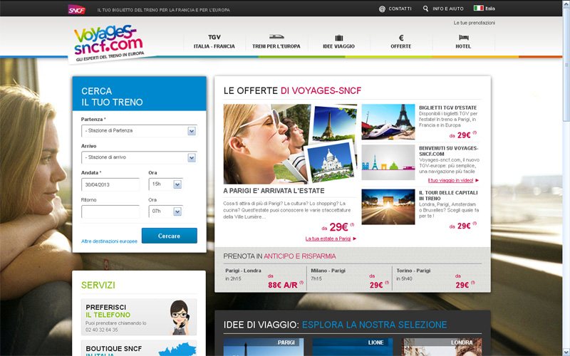 A partire dal 24 aprile 2013, sarà disponibile anche in Italia Voyages-sncf.com, una nuova porta d'accesso con un'anima francese per tutte le destinazioni di viaggio. Tgv-europe.com diventerà quindi Voyages-sncf.com, punto di riferimento per l'acquisto dei biglietti ferroviari europei. Il nuovo portale, che in Francia già rappresenta il principale sito di e-commerce (Fatturato annuale di 3,6 miliardi di euro), e nel mondo uno tra i maggiori distributori in assoluto di biglietti ferroviari offrirà soluzioni nuove e su misura. Un nuovo strumento per il mercato italianoabituato, più di altri, alla ricerca di soluzioni di viaggio in Rete, come dimostra una nuova indagine sulle abitudini di italiani, francesi, belgi e tedeschi.