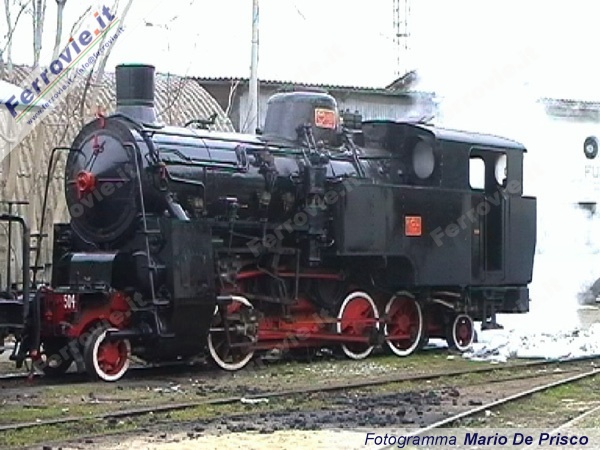 1. Tutta lustra al termine di questa mini corsa di prova, solo poche centinaia di metri, la nostra vaporiera si appresta ad essere ricoverata nel capannone per una ulteriore serie di regolazioni che la metteranno in grado, fra poche settimane, di affrontare una nuovo ciclo di vita alla testa di treni speciali da organizzare nel catanzarese. (Fotogramma Mario De Prisco, 26 febbraio 2003)