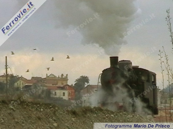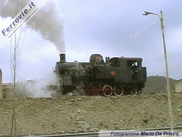 3. Ormai al culmine della salita, la vaporiera può proseguire per inerzia fino a qualche decina di metri di distanza dallo scambio che immette su uno dei due binari della stazione di Cosenza Centro. Recentemente uno dei due binari che collegavano il deposito alla stazione é stato rimosso per fare spazio alla arteria stradale che ha preso il posto della linea ferrata delle FS che collegava il vecchio fabbricato viaggiatori alla stazione di Castiglione Cosentino. (Fotogramma Mario De Prisco, 26 febbraio 2003)