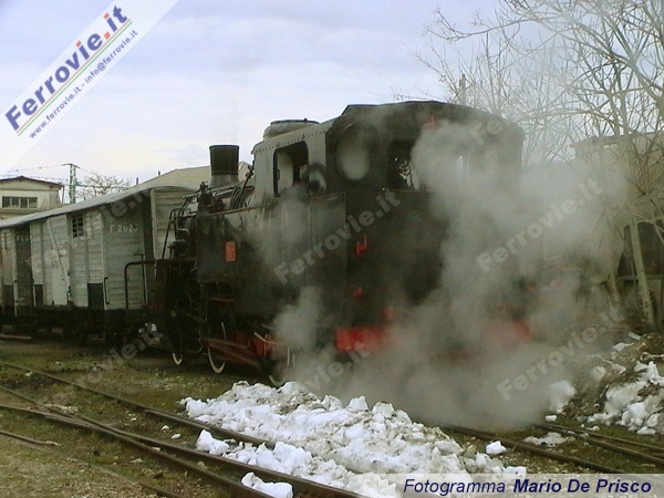 2. Al massimo dello sforzo per superare la breve ma dura rampa che separa il deposito locomotive cosentino dalla vicina stazione di Cosenza centro. (Fotogramma Mario De Prisco, 26 febbraio 2003)