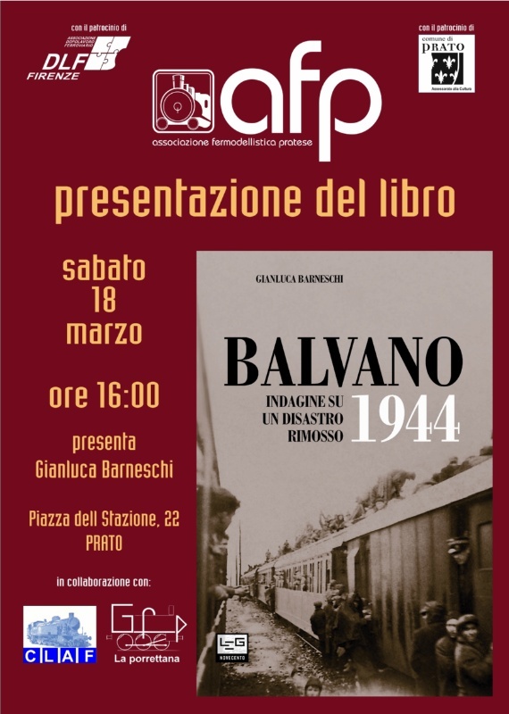 Sì terrà sabato 18 marzo alle ore 16.00, nei locali dell'Associazione Ferromodellistico Pratese, la presentazione del libro "Balvano 1944 - Indagine su un disastro rimosso" con la partecipazione dell'autore Gianluca Barneschi. Indirizzo AFP: Piazza della Stazione, 22 - Prato.