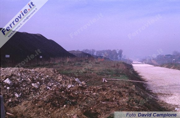 La sede ferroviaria in preparazione presso Pignataro Interamna; sulla sinistra cumuli di massicciata in attesa... dei binari! (Foto David Campione, 14 dicembre 1998)