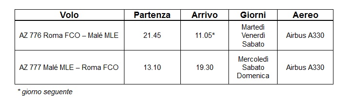 Con questi orari i passeggeri Alitalia in partenza da oltre 50 città italiane e internazionali potranno raggiungere gli atolli delle Maldive con comode coincidenze presso l'hub di Roma Fiumicino. Su questa nuova rotta voleranno aerei Airbus A330 che dispongono di 250 posti a sedere divisi in tre classi di servizio: Business, Premium Economy ed Economy. A bordo i passeggeri Alitalia troveranno allestimenti di cabina completamente rinnovati, il servizio di connettività Wi-Fi per telefonate, internet ed email e, in Business Class, poltrone che si reclinano fino a diventare un comodo letto. Sarà inoltre disponibile il servizio "Dine Anytime", il nuovo modello di ristorazione che consente ai passeggeri di business di decidere quando consumare il pasto a bordo. I viaggiatori di Premium Economy troveranno servizi dedicati. Anche in classe Economy, Alitalia assicura il massimo comfort ai suoi passeggeri.