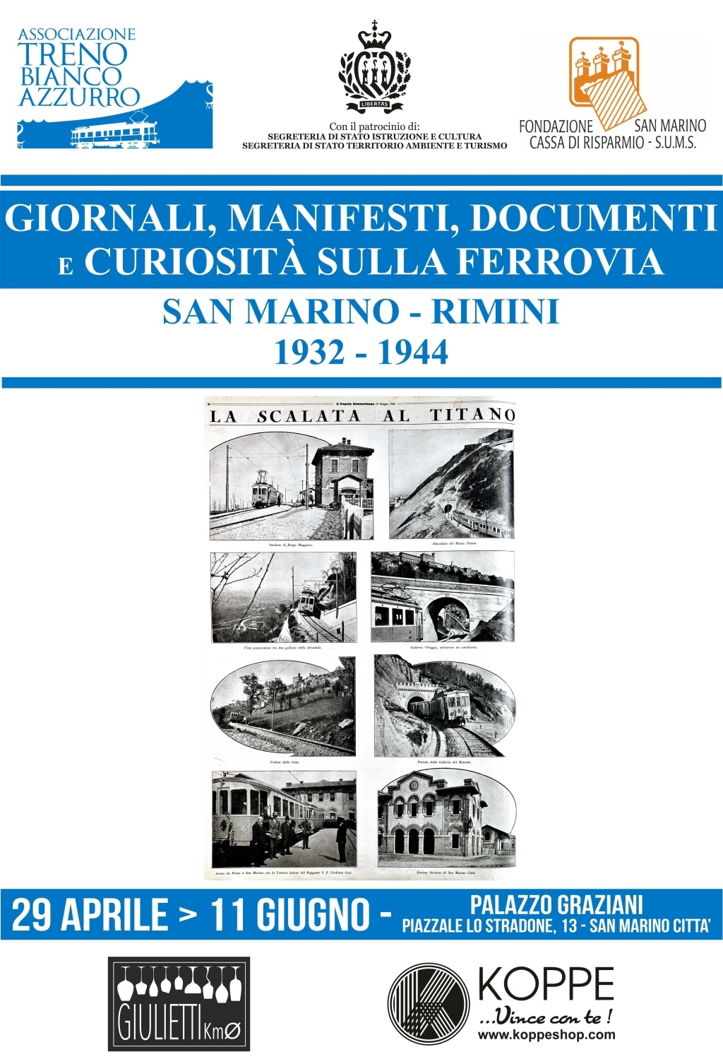 "Giornali, manifesti, documenti, curiosità, sulla ferrovia San Marino - Rimini" è il nome della mostra organizzata dall'Associazione Treno Bianco Azzurro che sarà inaugurata sabato 29 aprile. La manifestazione sarà visitabile gratuitamente da domenica 30 aprile a domenica 11 giugno, dalle ore 10:00 alle ore 18:00 presso palazzo Graziani - Piazzale Lo Stradone 13 (a pochi passa dalla porta del Pese) centro storico San Marino città, nella Repubblica di San Marino, in occasione dell'85° dell'inaugurazione (1932 - 2017) che cadrà il 12 giugno.