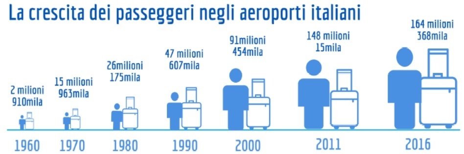 Il trasporto aereo è cresciuto anche negli anni della crisi. Tra il 2007 e il 2017, nel decennio della crisi economica globale, il trasporto aereo in Italia è aumentato del 21,8%. Nel 2016 il traffico negli scali italiani ha superato i 164 milioni di passeggeri. La crescita nell'ultimo quinquennio è stata dell'11,1% e solo nell'ultimo anno del 4,6%. Anche la congiuntura più recente è molto positiva: +6,6% nel primo quadrimestre del 2017.