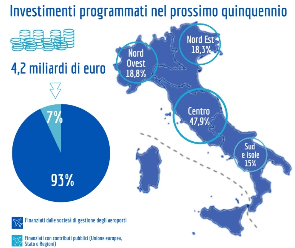 I nuovi contratti di programma nati dalla collaborazione tra Assaeroporti e le istituzioni competenti prevedono investimenti di circa 4,2 miliardi di euro in un quinquennio. Di questi, il 93% proviene dalle risorse proprie delle società di gestione e solo il 7% è finanziato con risorse pubbliche (Ue, Stato, Regioni). La maggior parte della spesa (47,9%) interessa il Centro Italia, per la rilevanza di Fiumicino. Gli aeroporti del Nord-Ovest e del Nord-Est generano rispettivamente il 18,8% e il 18,3% degli investimenti. Agli scali del Sud corrisponde il 15% del totale delle risorse. Gli interventi programmati sono finalizzati sia all'incremento della capacità aeroportuale (hard infrastructuring), sia al miglioramento dei servizi (airport experience).
