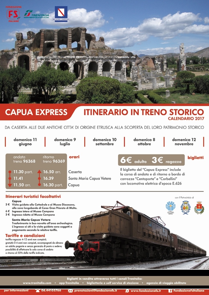 Domenica 11 giugno nuovo collegamento con treno storico in Campania. Parte il "Capua Express", da Caserta a Santa Maria Capua Vetere e Capua, alla scoperta dei tesori delle due città di origine etrusca.