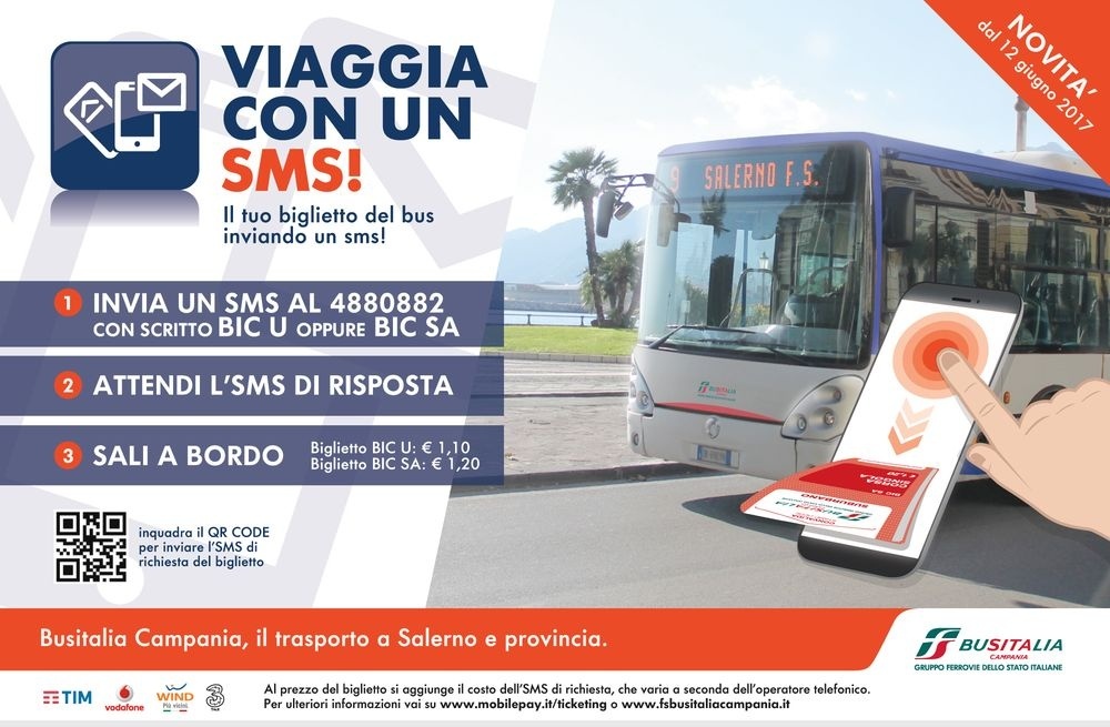 Busitalia Campania, la società del Gruppo FS Italiane che da gennaio di quest'anno gestisce il trasporto urbano ed extraurbano nella provincia di Salerno, promuove sul territorio il servizio di acquisto del titolo di viaggio con SMS, già molto apprezzato in numerose città italiane, con un milione di clienti e circa 17 milioni di biglietti venduti dal suo lancio. Il servizio di Mobile Ticketing, disponibile per i clienti di Wind, 3, TIM e Vodafone Italia e realizzato in collaborazione con Netsize (azienda del gruppo Gemalto), consente di acquistare il biglietto Busitalia Campania per l'area urbana e suburbana di Salerno, inviando un semplice SMS, senza alcuna operazione di preregistrazione e senza l'uso di carta di credito.