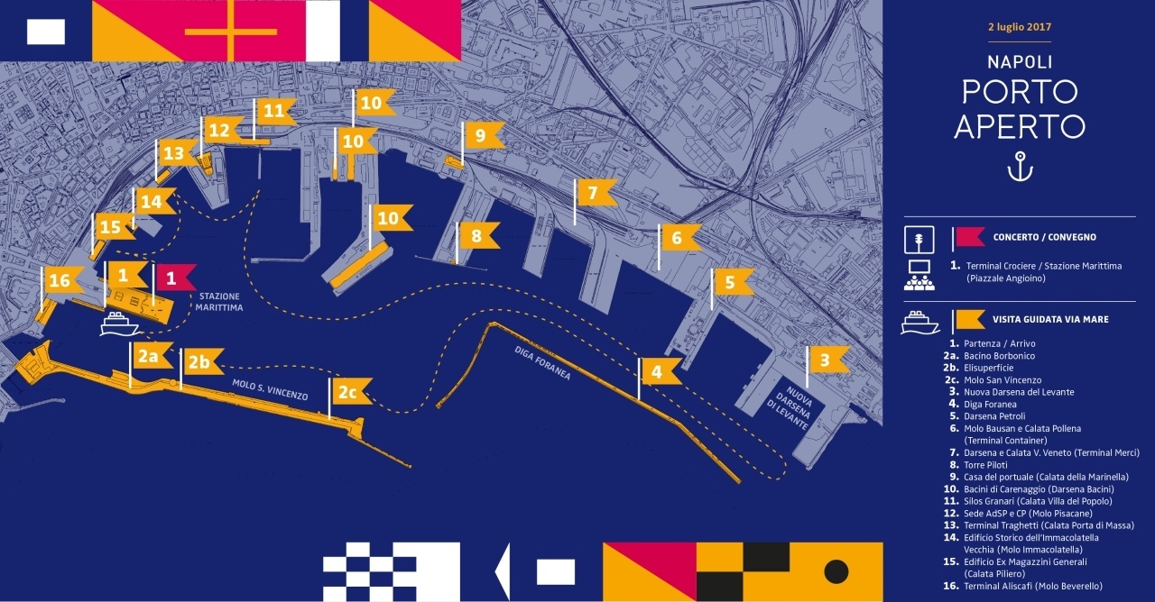 La Rosa D'Abundo, dopo aver mollato gli ormeggi del Molo Angioino, si è diretta verso lo storico Bacino Borbonico e costeggiando il molo San Vincenzo ha puntato verso la diga foranea, che ha seguito in tutta la sua lunghezza fino all'estremità sud-orientale del porto. La navigazione turistica ha dato modo di osservare da vicino la torre Piloti, i terminal container e merci, la darsena petroli ed ancora la nuova Darsena di Levante lunga 650 metri, che una volta completata insieme ai lavori di dragaggio dei fondali, potrà accogliere navi con capacità di 15.000 TEU e pescaggio di 15 metri, contro il limite attuale del porto di Napoli che è di 10.000 TEU. La Darsena di Levante sarà attrezzata anche con infrastruttura ferroviaria, che consentirà il collegamento diretto dal Porto di Napoli verso gli interporti di Nola e Marcianise attraverso la rete di RFI (vedi Brevi ferroviarie del 19/04/2017).