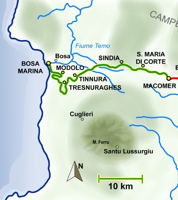 Questa prima parte della linea presenta un tracciato particolarmente lungo e tortuoso (comunque con curve di raggio mai inferiore ad 80 metri) che venne individuato in sede di progettazione per accogliere le proteste, in particolare delle popolazioni di Tresnuraghes, Magomadas e Cuglieri ma anche della Planargia tutta, insorte quando fu ventilata la costruzione della ferrovia passando a nord est, ovvero seguendo il più agevole e breve itinerario lungo il fiume Temo, che però avrebbe tagliato fuori diversi centri abitati del sud est peraltro attraversando aree poco o per nulla abitate. La stazione di Tresnuraghes fu così il giusto compromesso per servire anche gli abitati di Magomadas e Cuglieri.