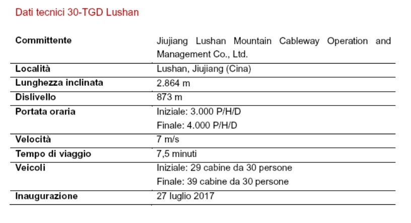 Il nuovo impianto a fune fornisce un significativo miglioramento del comfort per i visitatori. Esso opererà in estate e in inverno sostituendo un servizio di autobus lungo una strada molto tortuosa e lunga 15 chilometri. La cabinovia 3S scelta per Lushan è un impianto a moto unidirezionale continuo ad ammorsamento automatico. La regione è stata designata come sito patrimonio mondiale dell'UNESCO nel 1990. La funivia attraversa l'area protetta con facilità, grazie ad una campata di quasi 1.600 metri di lunghezza senza sostegni. In concomitanza con la capacità di trasporto richiesta, questo era l'unico sistema in grado di soddisfare i requisiti.
