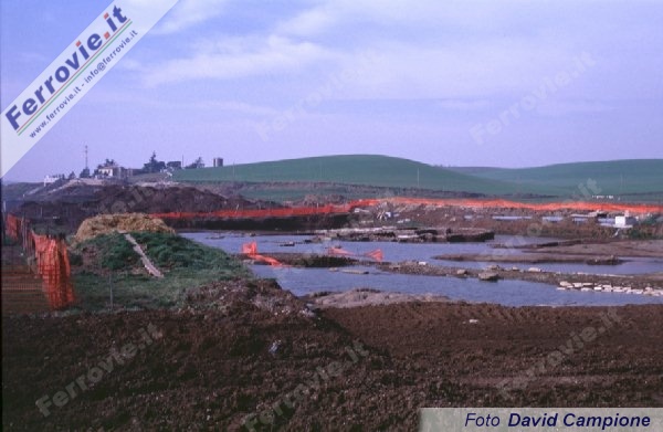 Il ritrovamento di reperti archeologici ha causato in più punti l'interruzione dei lavori. Qui siamo tra Colleferro ed Anagni, dove durante i lavori di scavo sono venuti alla luce i resti di una costruzione, probabilmente un'area di ristoro per i viaggiatori che transitavano sulla vicina via Casilina. Sullo sfondo a sinistra è riconoscibile il rilevato per la sede ferroviaria, interrotto in prossimità del ritrovamento. (Foto David Campione, 2 marzo 1999)