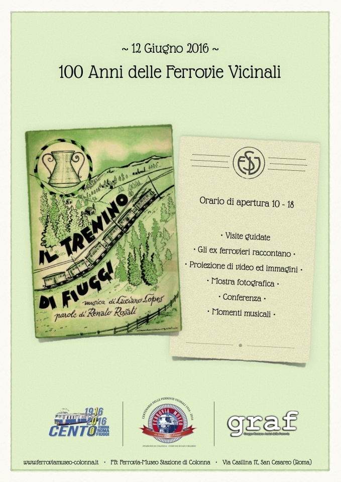Domenica 12 giugno, presso la Ferrovia-Museo stazione di Colonna si festeggiano i 100 anni delle Ferrovie Vicinali. Dalle 10 alle 18 visite guidate, gli ex ferrovieri raccontano, proiezione di video e immagini, mostra fotografica, conferenza e momenti musicali. Oltre all'esposizione permanente di rotabili della ex Ferrovia Roma - Fiuggi.
