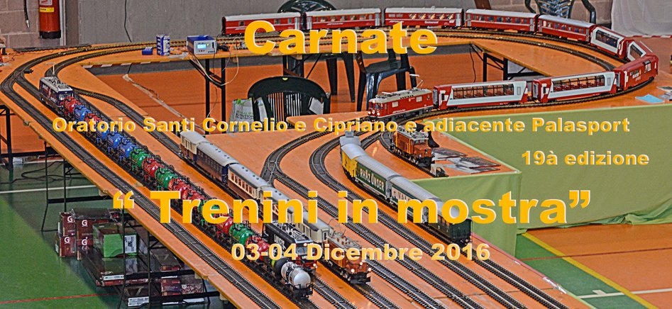 IL Gruppo Fermodellistico Sala Stazione organizza a Carnate (MB), presso i locali dell'oratorio di Via San Cornelio e Cipriano e presso la palestra ed i locali della Scuola Elementare di Via Premoli 19 ,la 20° esposizione di modellismo ferroviario con borsa scambio nella giornata di sabato.