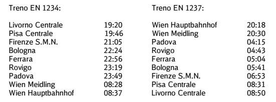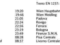 Il treno circolerà da Livorno via Pisa e Firenze ogni sabato fino al 26.09.2015, mentre il ritorno da Vienna circolerà ogni venerdì fino al 25.09.2015, così come in numerose date aggiuntive nei giorni festivi e in estate.