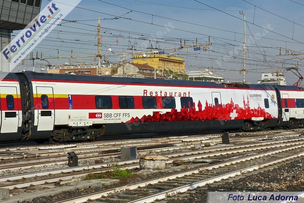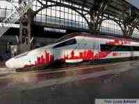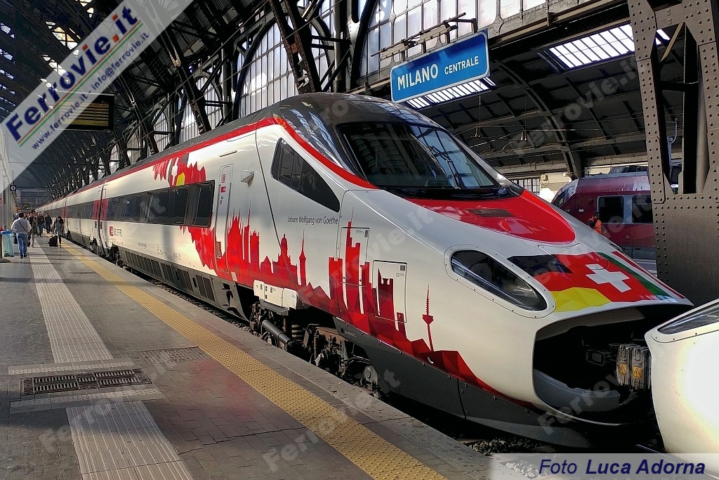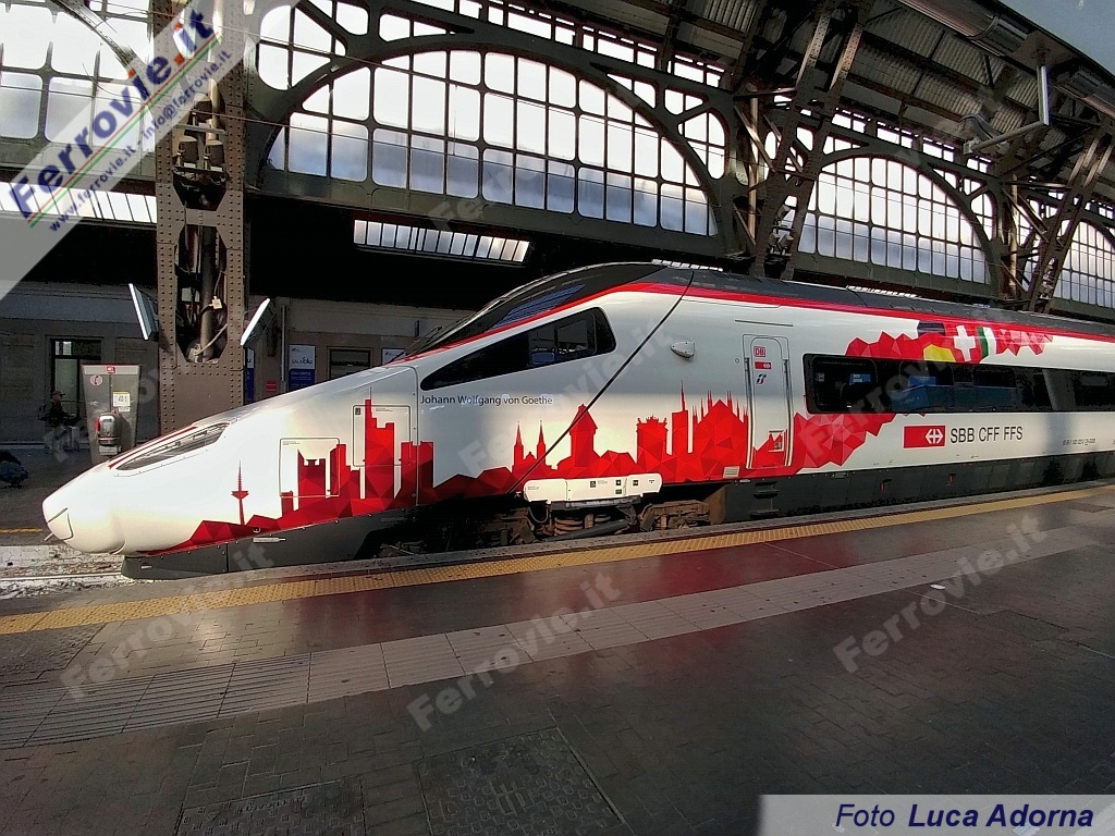 MILANO - In vista dell'imminente attivazione del collegamento Eurocity Milano - Francoforte via Svizzera, un elettrotreno ad assetto variabile delle FFS - Ferrovie Federali Svizzere ha ricevuto a fine ottobre una livrea celebrativa. Si tratta del RABe 503-22 "Johann Wolfgang von Goethe", che si presenta adesso con le due casse d'estremità e la carrozza ristorante (n.3) con stilizzato lo skyline di Milano, Basilea e Francoforte. Il motivo è completato dalle tre bandiere di Italia, Svizzera e Germania, riprodotte anche sul muso dell'elettrotreno tra i due fanali.
