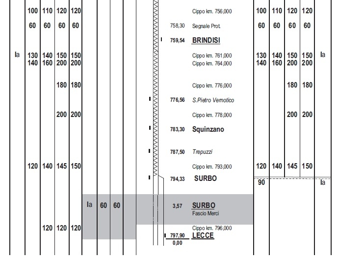 Le progressive chilometriche interesate all'innalzamento di velocità fino a 200 km/h (per i rangi C e P), vanno dal km 764 al km 776 e dal km 778 al km 793 per entrambi i binari, tra le stazioni di Brindisi e Surbo, mentre per i restanti tratti resta in vigore la velocità massima preesistente, che non supera i 150 km/h.