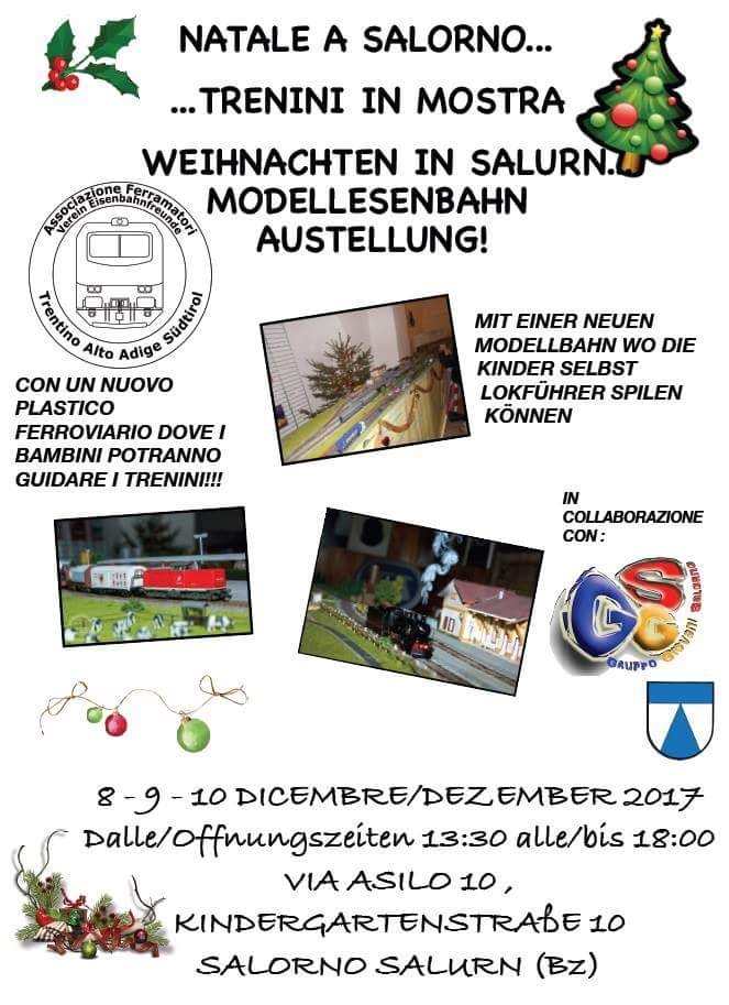 Evento da non perdere in Alto Adige, a Salorno. I giorni 8, 9 e 10 dicembre dalle ore 13:30 alle ore 18, "Trenini in Mostra" con esposizione plastico modulare di circa 30 mt e vari circuiti ferroviari dove i bambini potranno giocare!