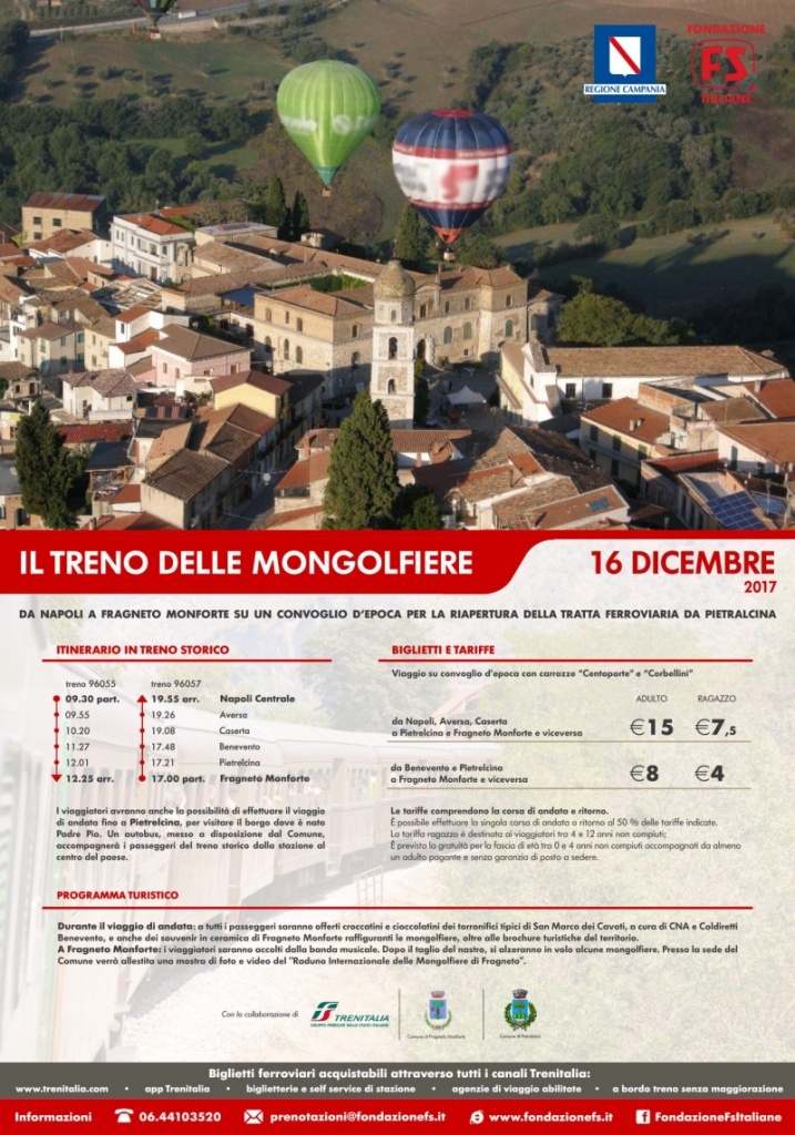 Sabato 16 dicembre, alle 9.30, partirà dalla Stazione Centrale di Napoli "Il Treno delle Mongolfiere". Composto da locomotiva Diesel e carrozze degli anni '30, il treno raggiungerà la stazione Fragneto Monforte, dove è in programma una cerimonia per festeggiare la restituzione al territorio di un ulteriore tratto della linea Benevento - Bosco Redole.