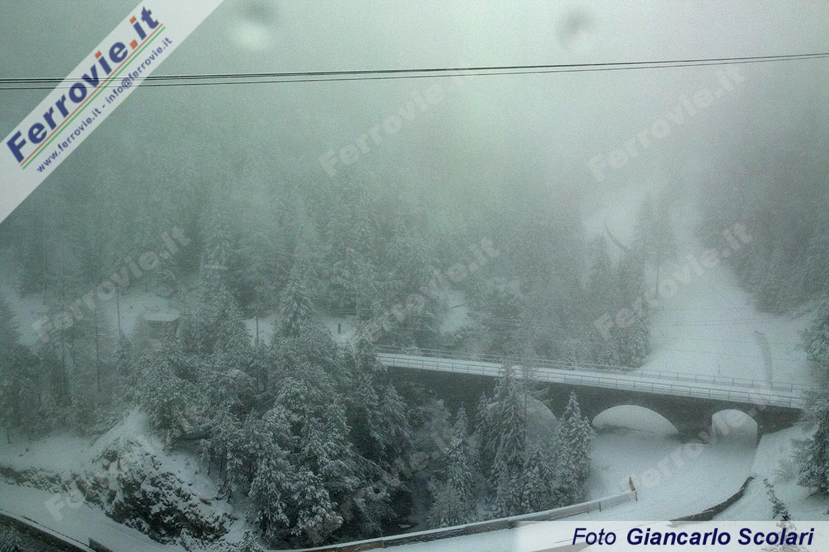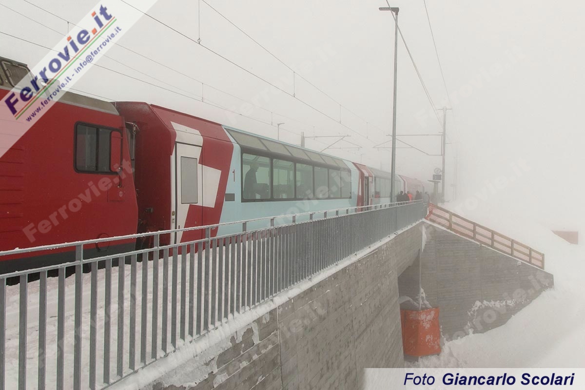 Nevica e purtroppo la nebbia non ci consente di gustarci il panorama. Il personale della MGB pulisce i marciapiedi dalla tanta neve caduta, mentre i viaggiatori cercano di fotografare il fotografabile e di farsi qualche selfie davanti al Glacier Express. Tornati a bordo possiamo rifocillarci con la tradizionale grappa servita sul Glacier.