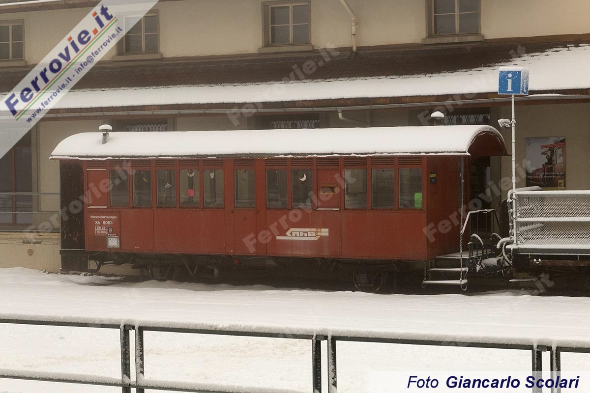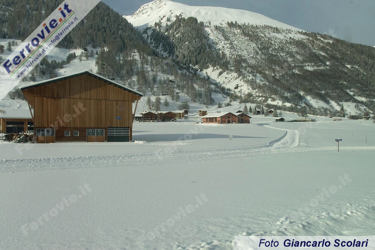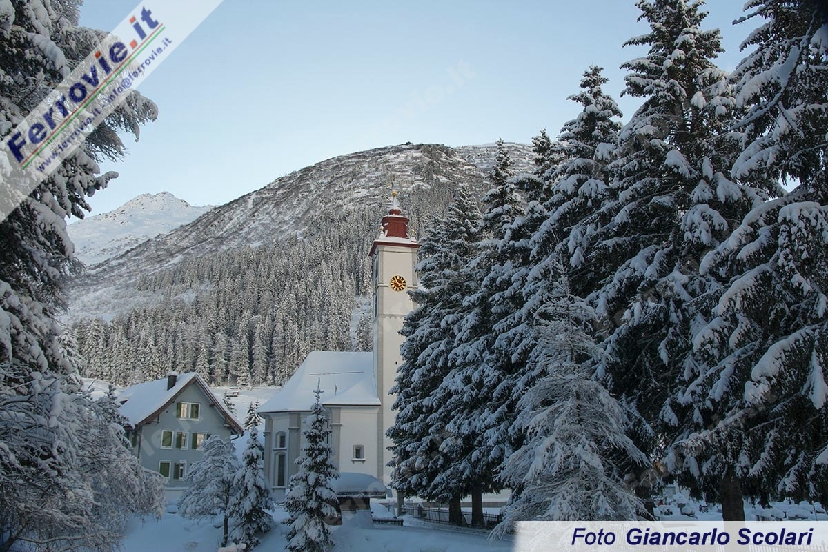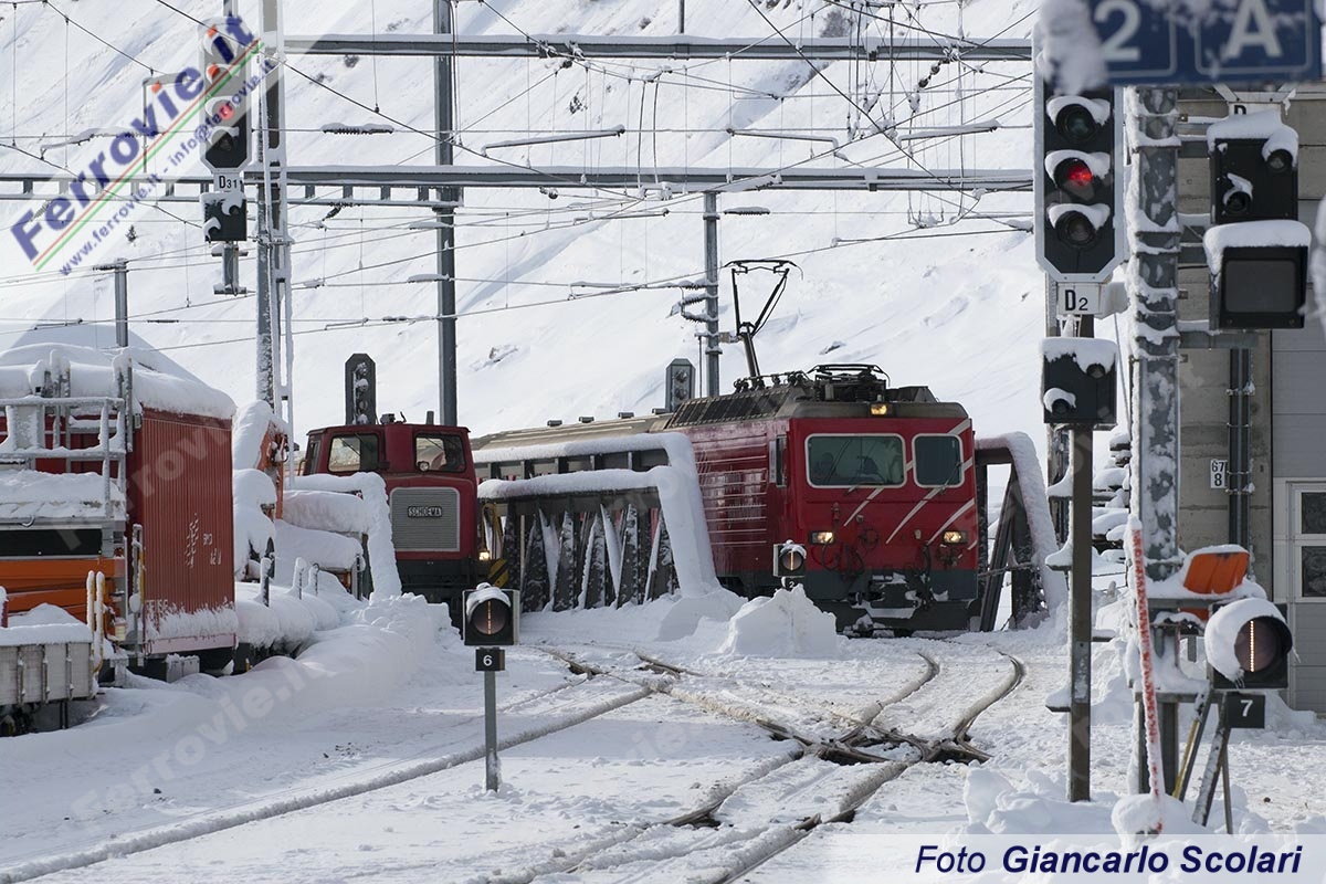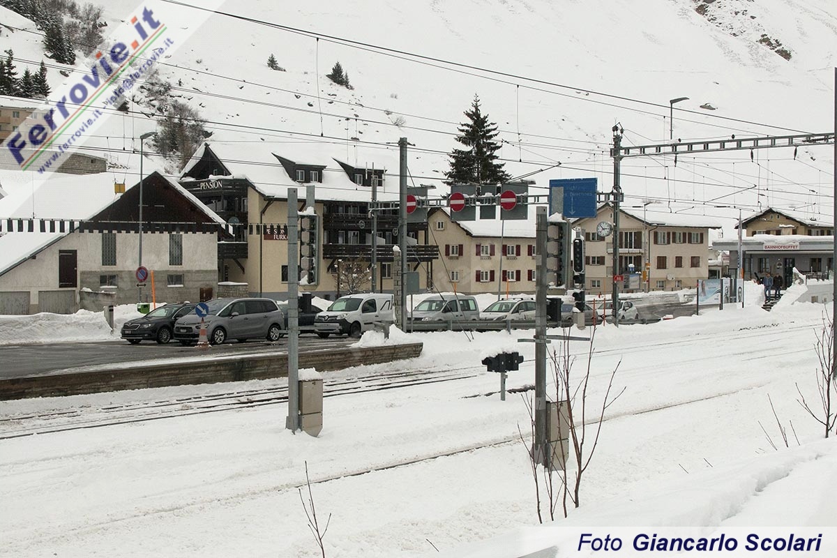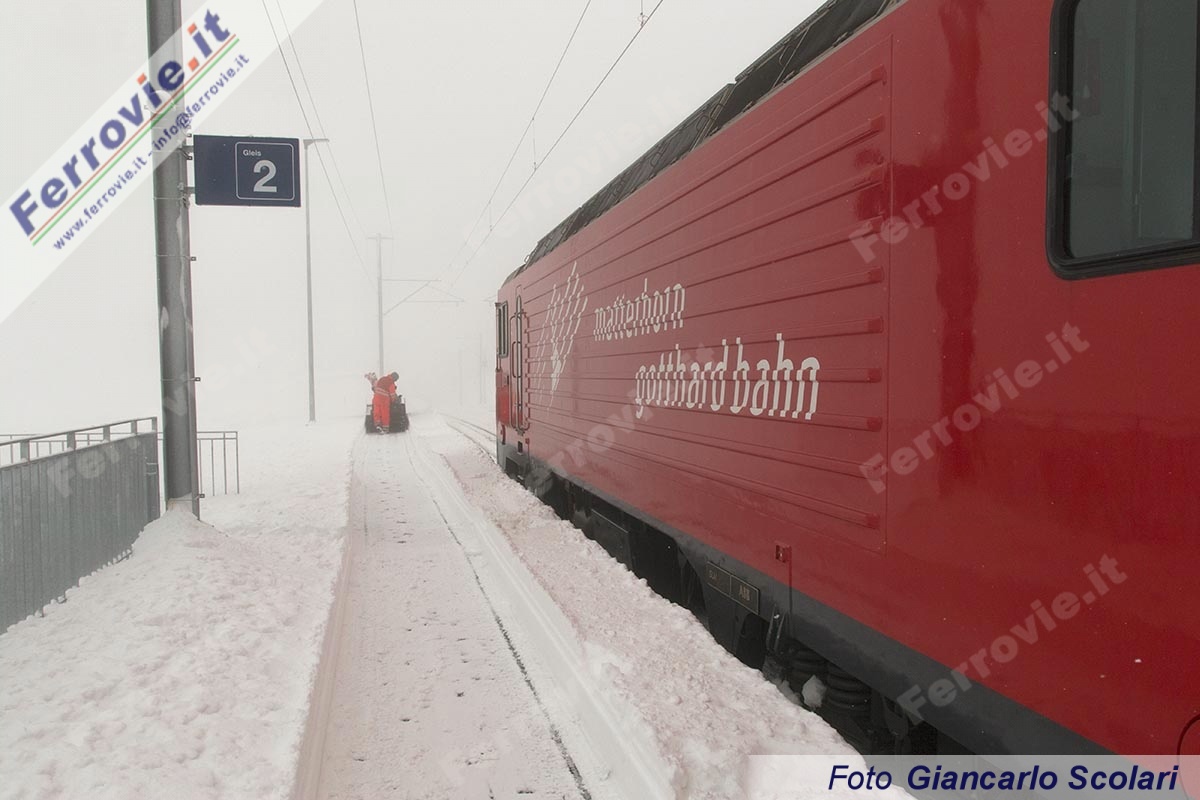 Da Sedrun in inverno è attivo il servizio auto al seguito per Andermatt, per la chiusura del passo stradale dell'Oberalp. Con il 110 per mille si sale ai 2.033 metri di altitudine del passo Oberalp, il punto più alto della linea e confine tra i cantoni Grigioni e Uri. Purtroppo la nebbia ci impedisce di ammirare le splendide montagne che fanno da scenario alla zona. A Natschen il treno effettua una sosta fotografica di 15 minuti.