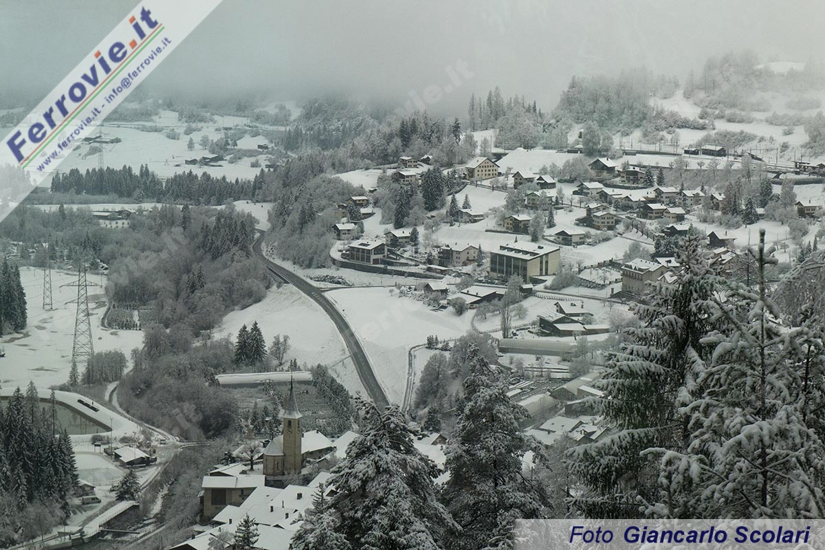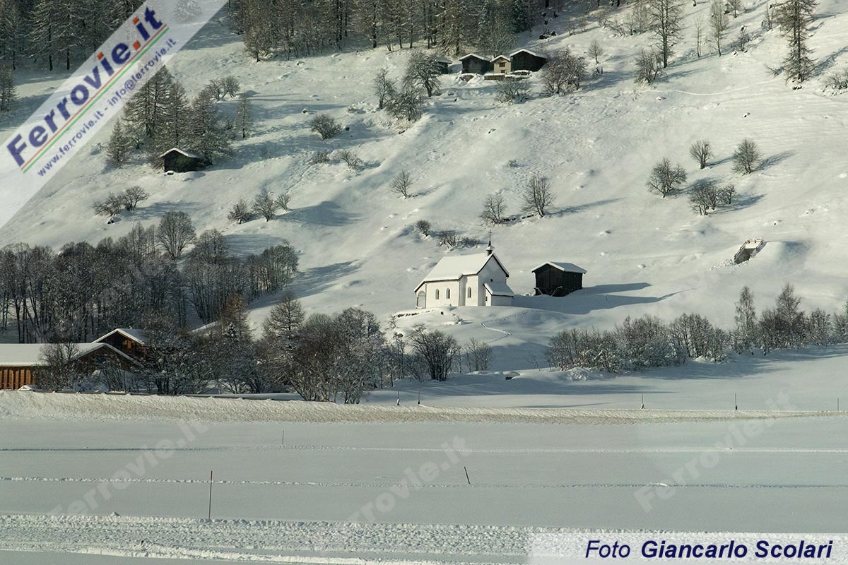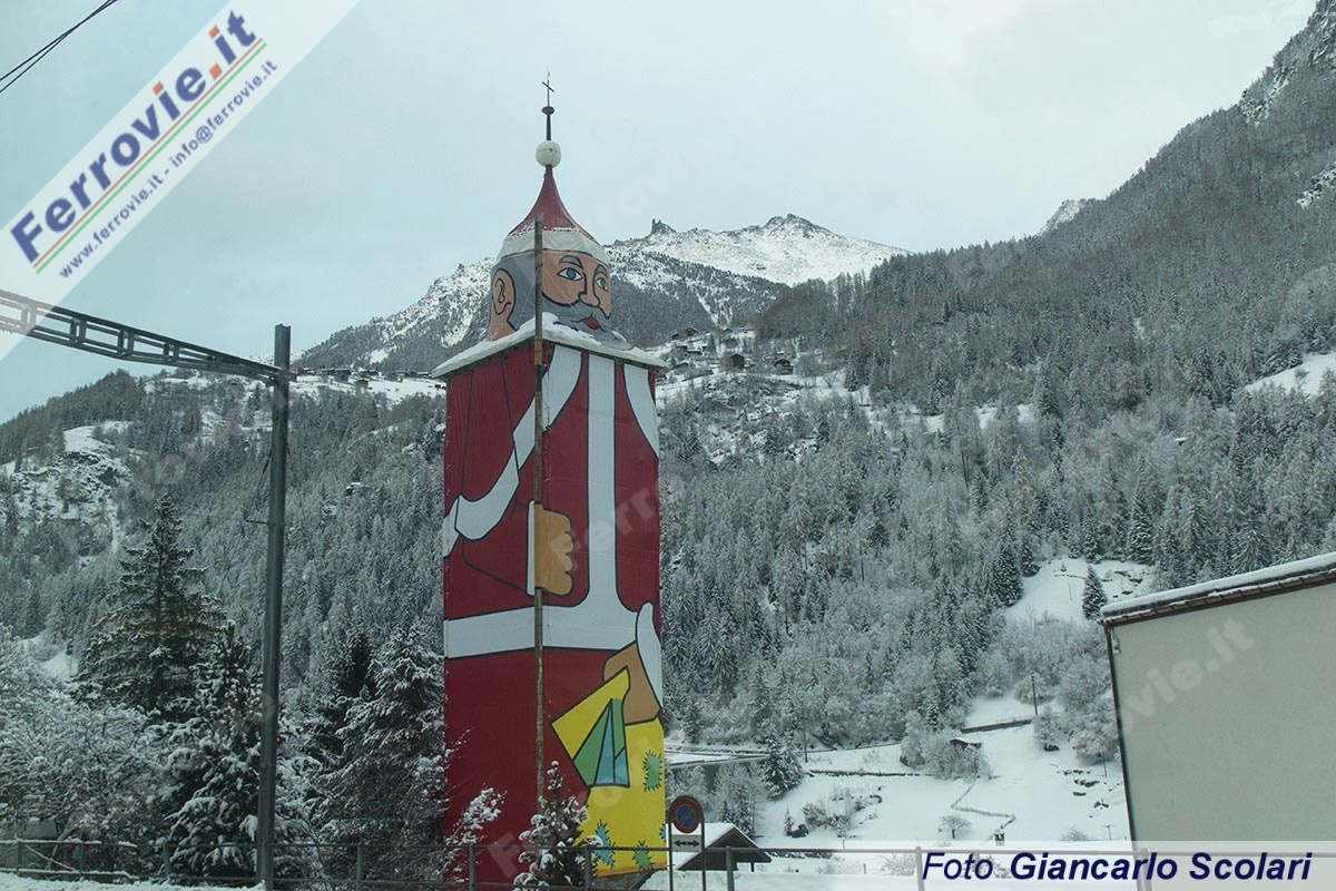 Fino a Zermatt da orario non abbiamo fermate per servizio commerciale, ma in realtà effettuiamo almeno due incroci con altri treni passeggeri e a St. Niklaus ci fermiamo per lasciare strada addirittura a un treno merci. Impensabile in Italia che il treno di maggior prestigio si fermi per incrociare un merci. La sosta ci permette però di ammirare il campanile della locale chiesa "travestito" da Babbo Natale.